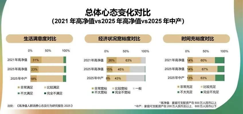 在经济宽裕度上,高净值家庭觉得非常宽裕的只有15%,而这个数字在2021年的时候则是28%。